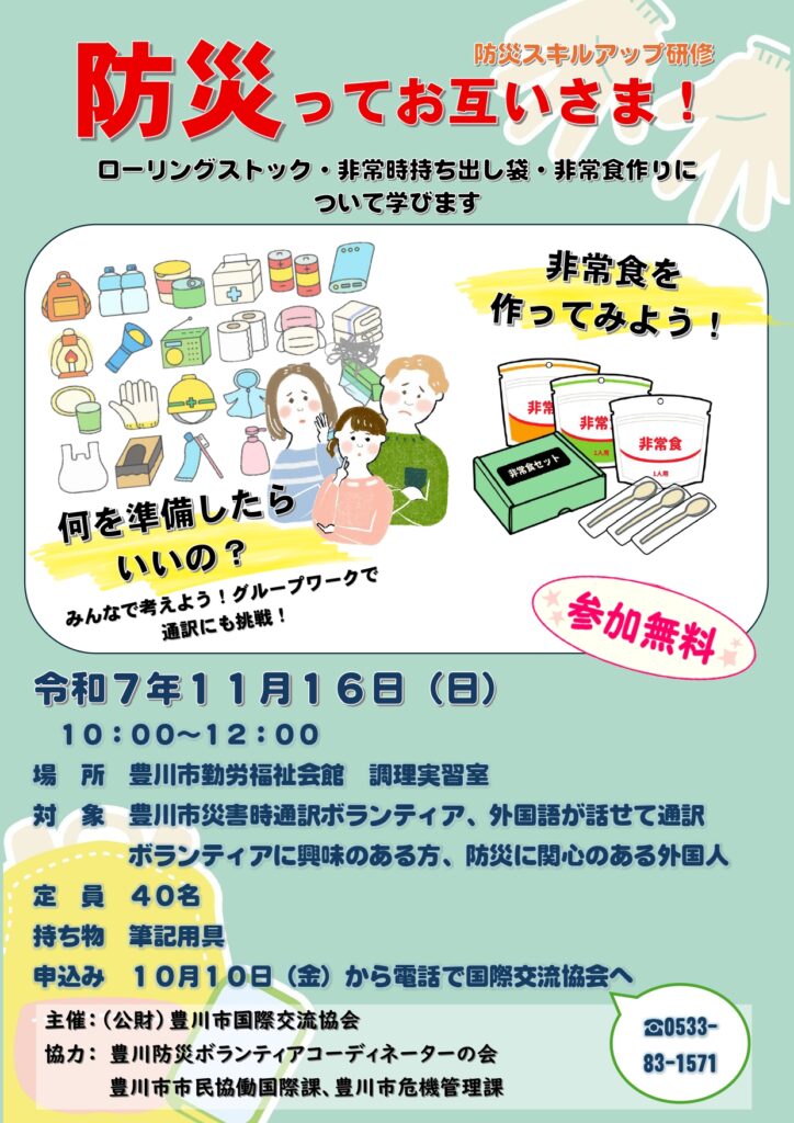 対象:豊川市災害時通訳ボランティア、外国語が話せて通訳ボランティアに興味のある方、防災に関心のある外国人